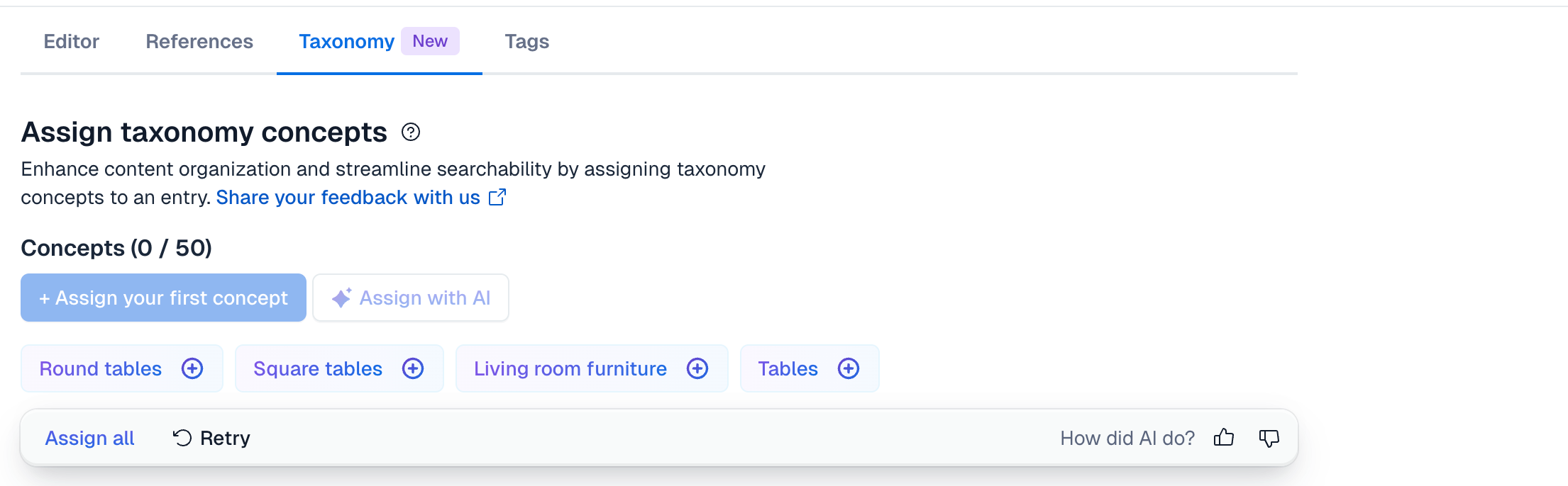 NOTE: For both entries and assets, you can regenerate the concept suggestions by clicking Retry to regenerate the list.