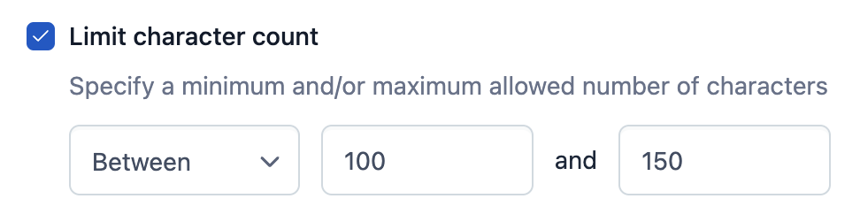 Utilize “Limit character count” functionality to allow between 100 and 150 characters.