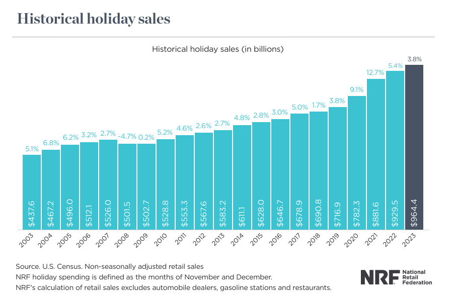 According to NRF, 2023 holiday sales hit a record $964.4 billion, up 3.8% from the previous year.