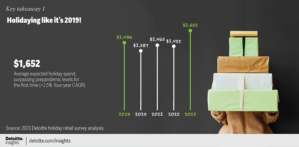 25. The average spend on gifts, non-gifts, and experiences rose to $1,652 in 2023, marking a 14% year-over-year increase. This is up from $1,496 in 2019, reflecting a compound annual growth rate (CAGR) of 2.5%.