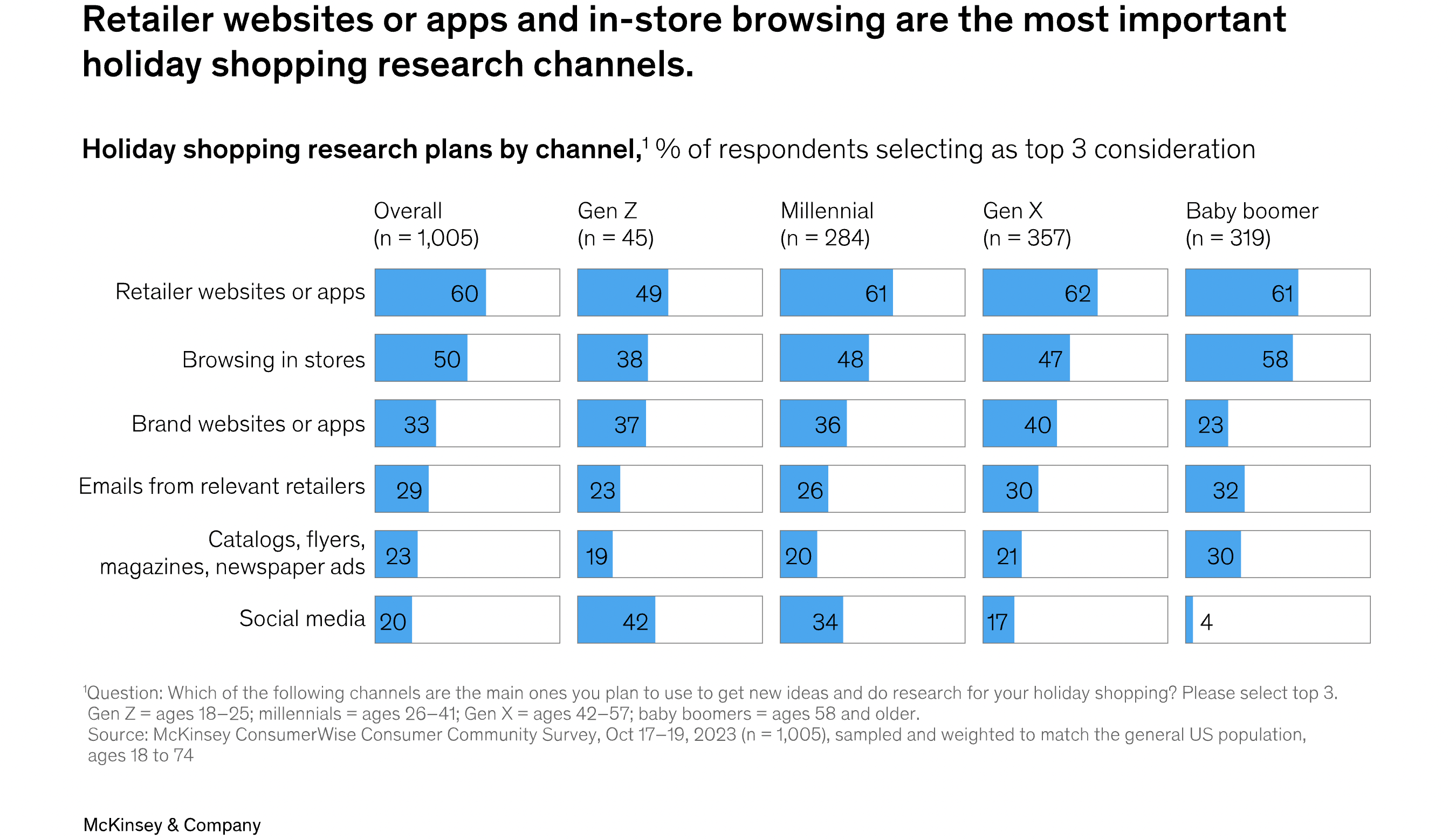 According to McKinsey, most consumers plan to do their holiday shopping research using retailer websites or apps and by browsing in-store. This underscores the importance of a strong omnichannel experience. Social media also plays a crucial role, especially for Gen Z and millennials, as a discovery channel for new products and deals.