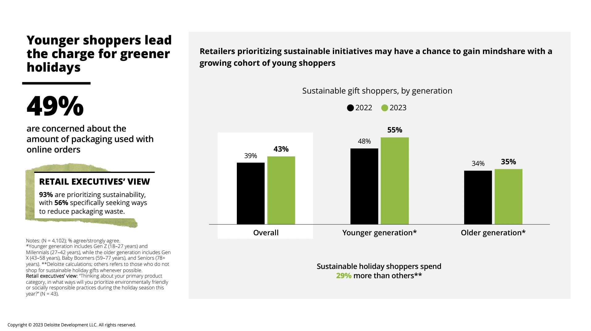 According to Deloitte, sustainable holiday shoppers spend 29% more than others. This shows that consumers are willing to invest more in products that align with their values, making sustainability not only good for the planet but also beneficial for businesses.