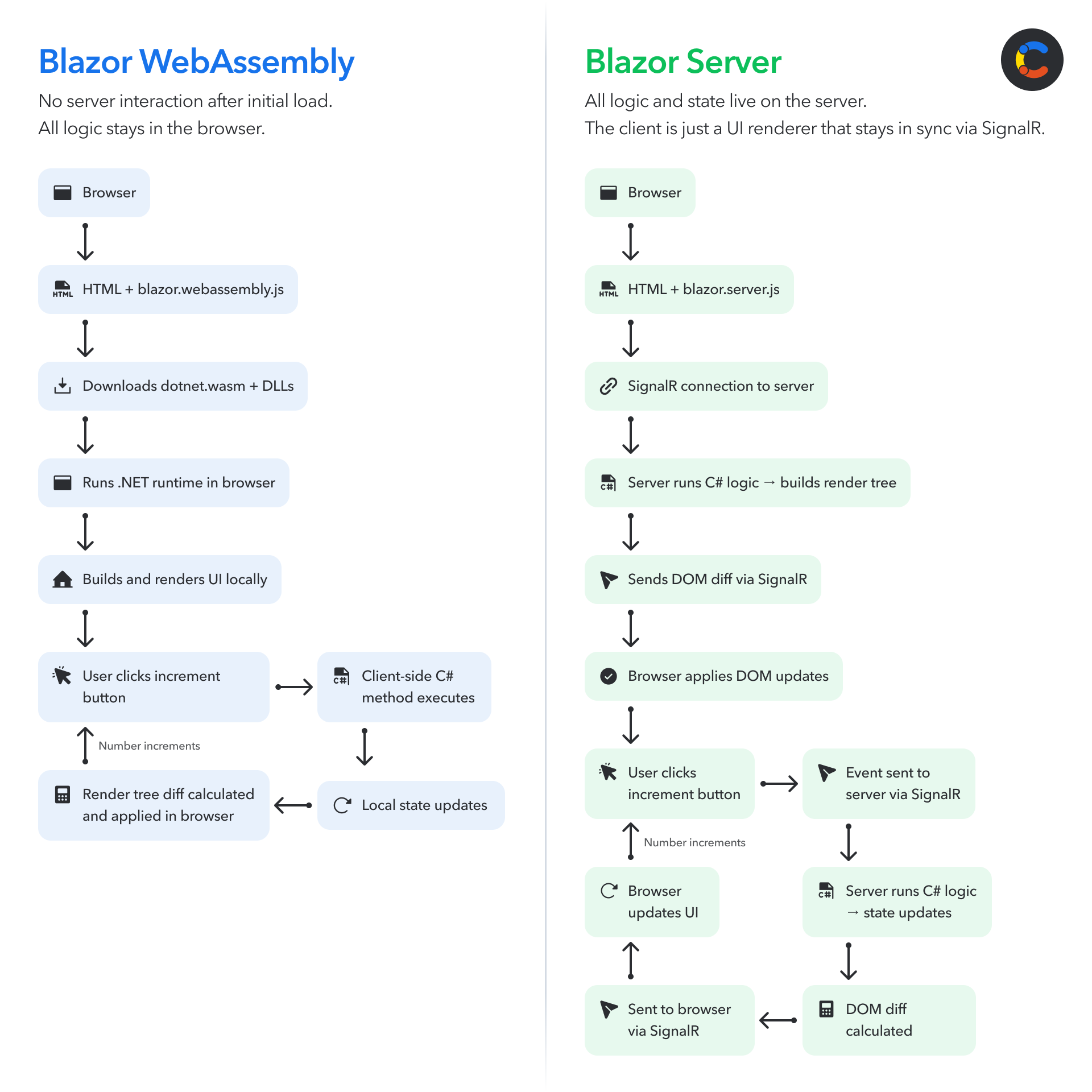 Blazor Server: Most of the logic is run on the server. The browser renders the UI and communicates user interactions back to the server in real time using SignalR (a .NET communication library).