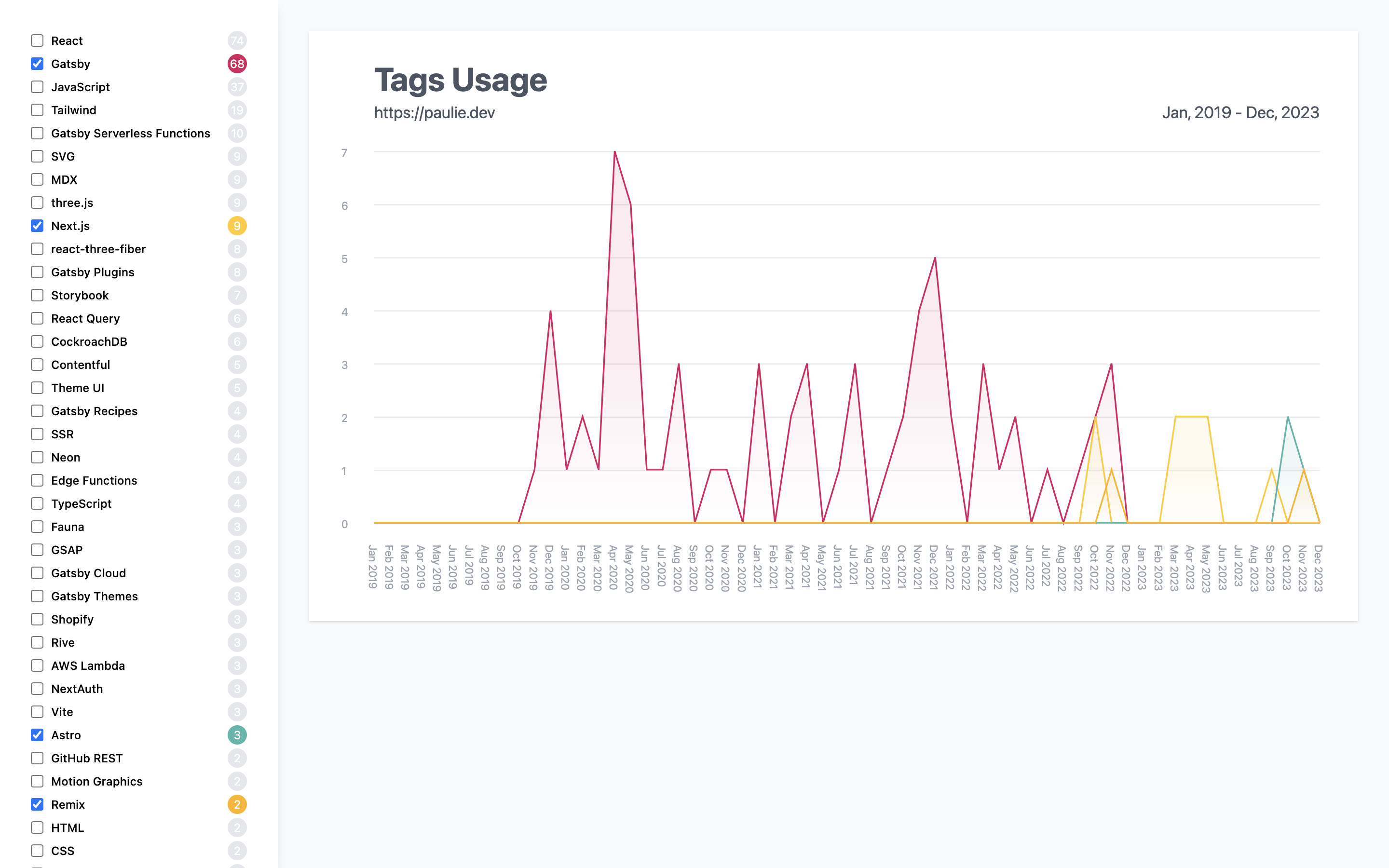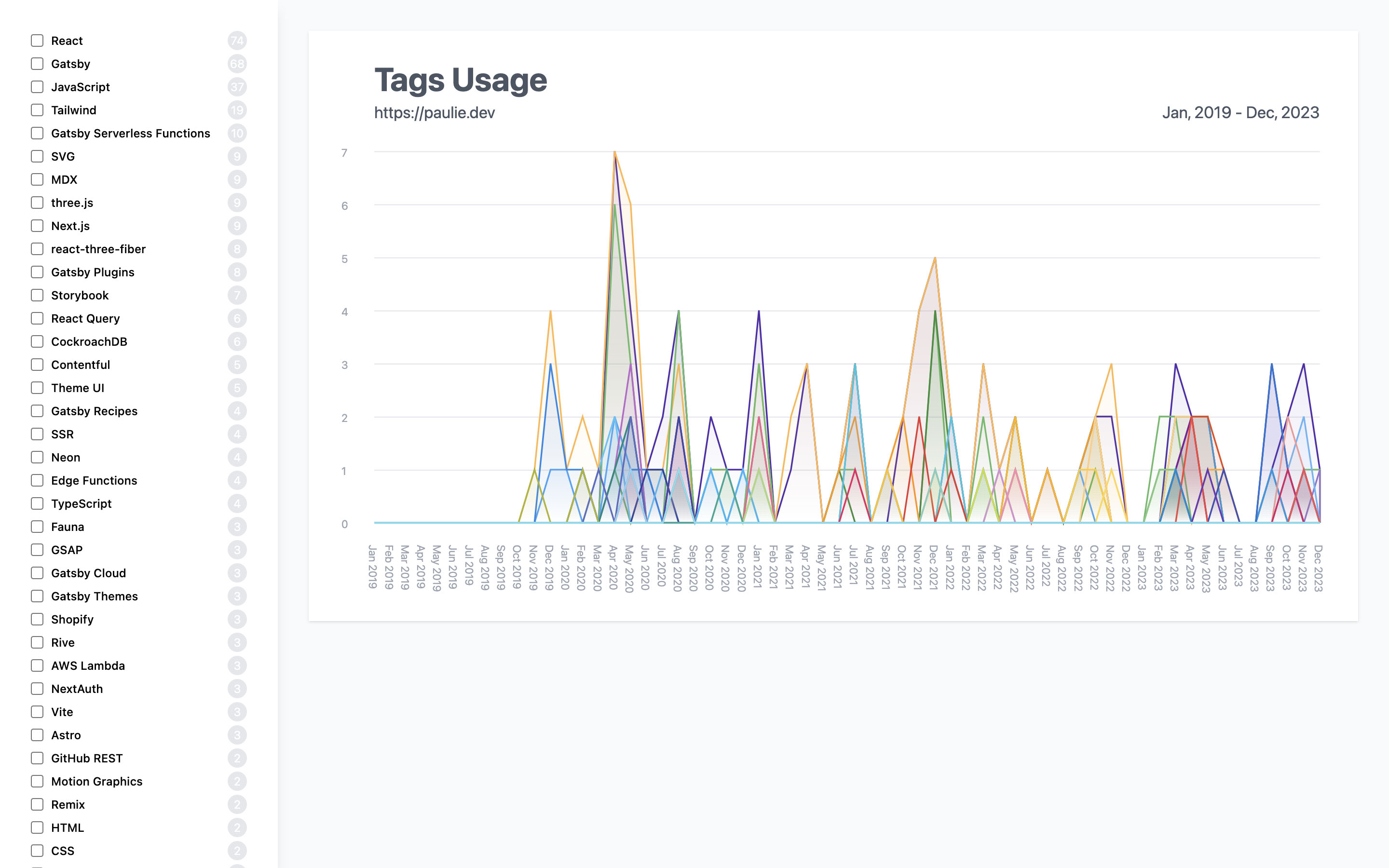In this post I'll show you how I created a time series chart to display tag usage from blog posts published on my site paulie.dev. I was curious to see what I'd been writing about over the last few years, where the crossovers were, and if I could learn anything new.