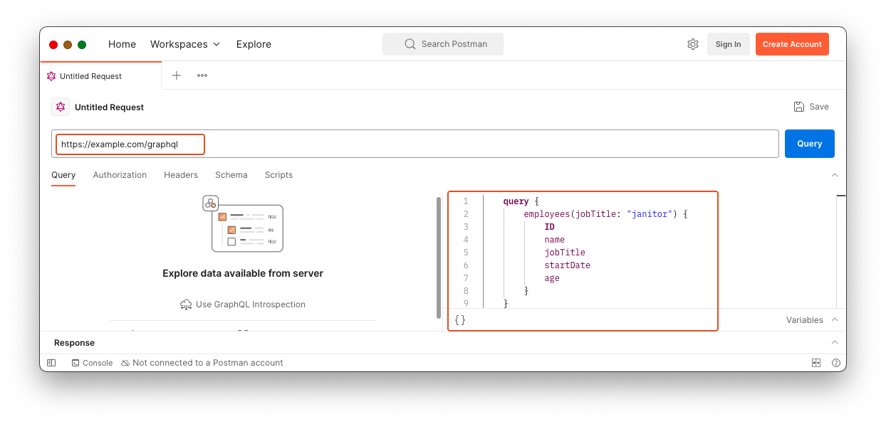 Once you have the schema of the data you want to query with GraphQL, you can write your query. The example query below searches the example schema above for employees with the job title "janitor":