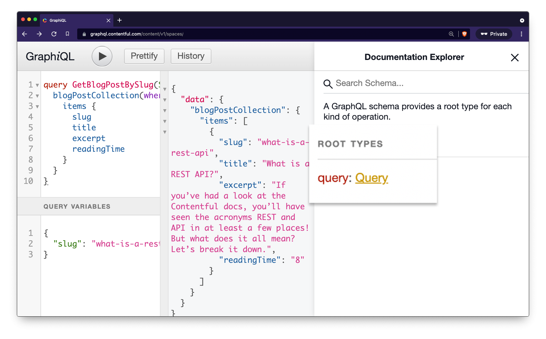 In the example shown in the GraphiQL explorer above, the top box in the left column shows a GraphQL query that has been entered. The query is defined with a $slug variable.Â