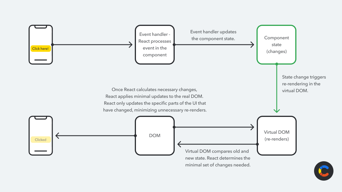 An illustration explaining React's process for handling events and efficiently re-rendering the UI using the virtual DOM for updates.