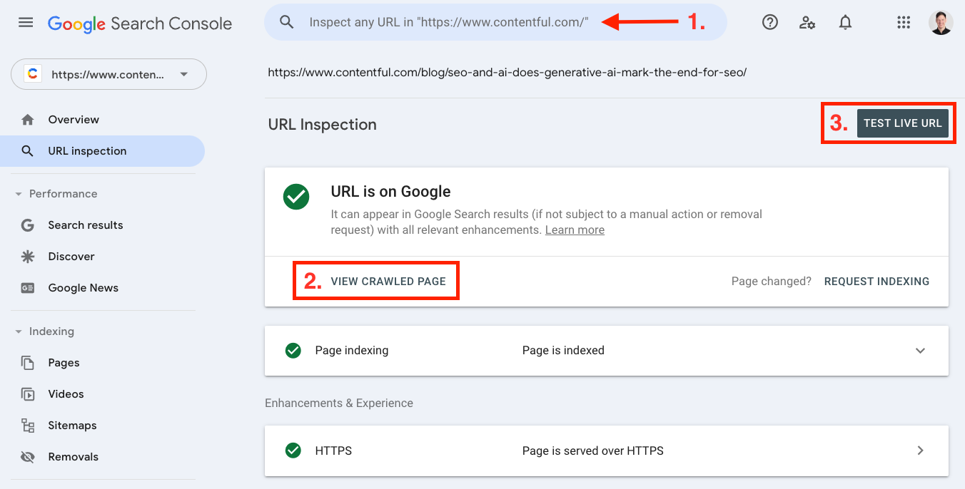 To check a specific page (a recommended exercise for your critical pages), use GSC’s URL Inspection Tool: