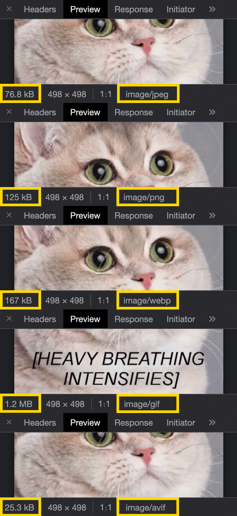 Chrome Developer Tools network tab shows the file size of the AVIF image format compared to other formats (for the same source image).