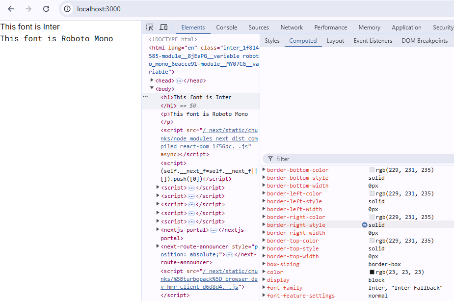 next/font/local in Next.jsKeep the same code for your app/page.js file as the Google font example above, and run your application again. Inspect the text in the browser to see that the Roboto font is being used.