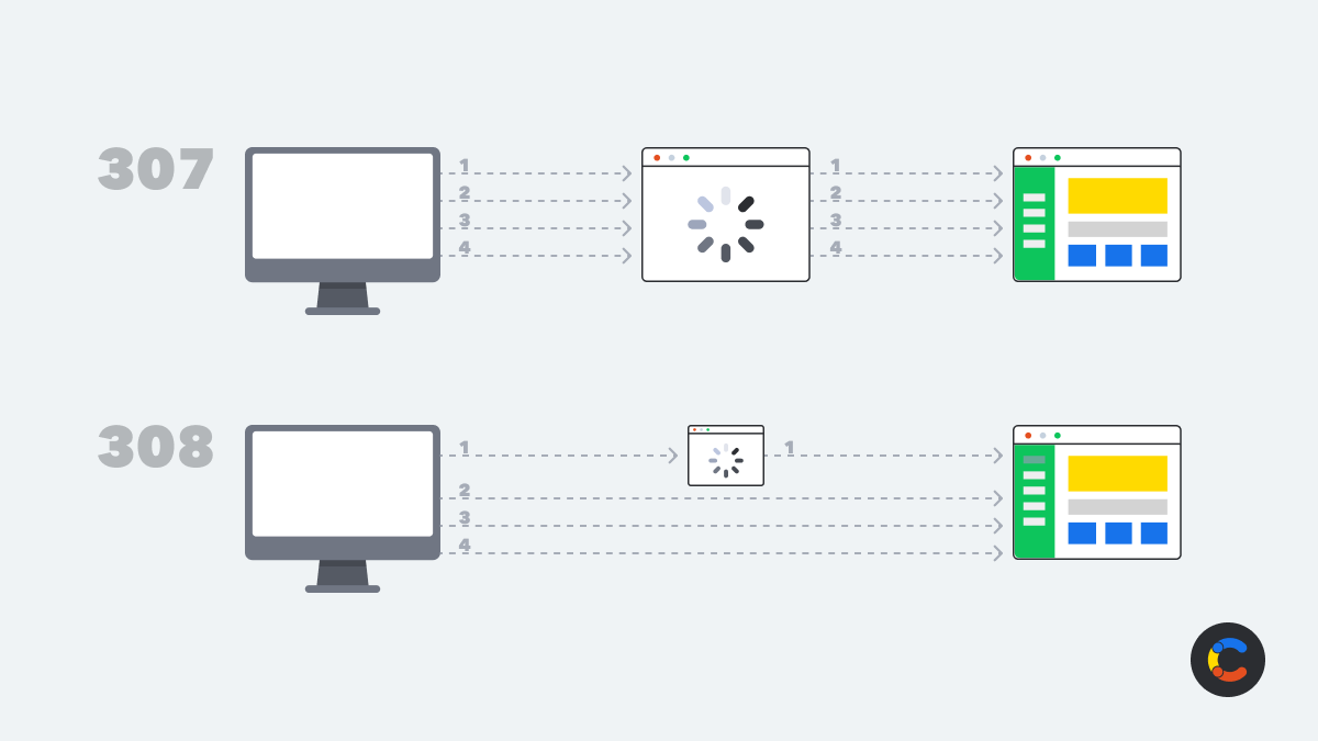 The 307 and 308 status codes differ from 301 and 302 codes in that they retain the original HTTP method of the initial request. Next.js redirects will return a 307 or 308 response by default. Here are the methods used to create permanent and temporary redirects in Next.js.