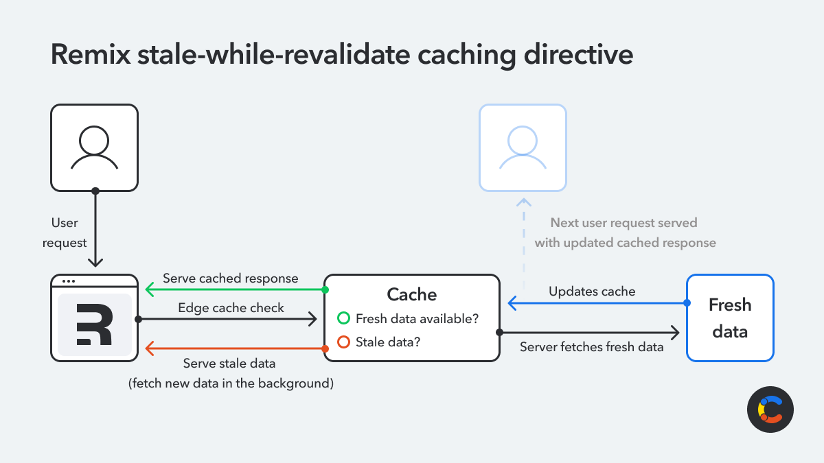 Stale-while-revalidate caching: Remix supports the stale-while revalidate caching directive, allowing cached content to be served until it can be refreshed with up-to-date data.