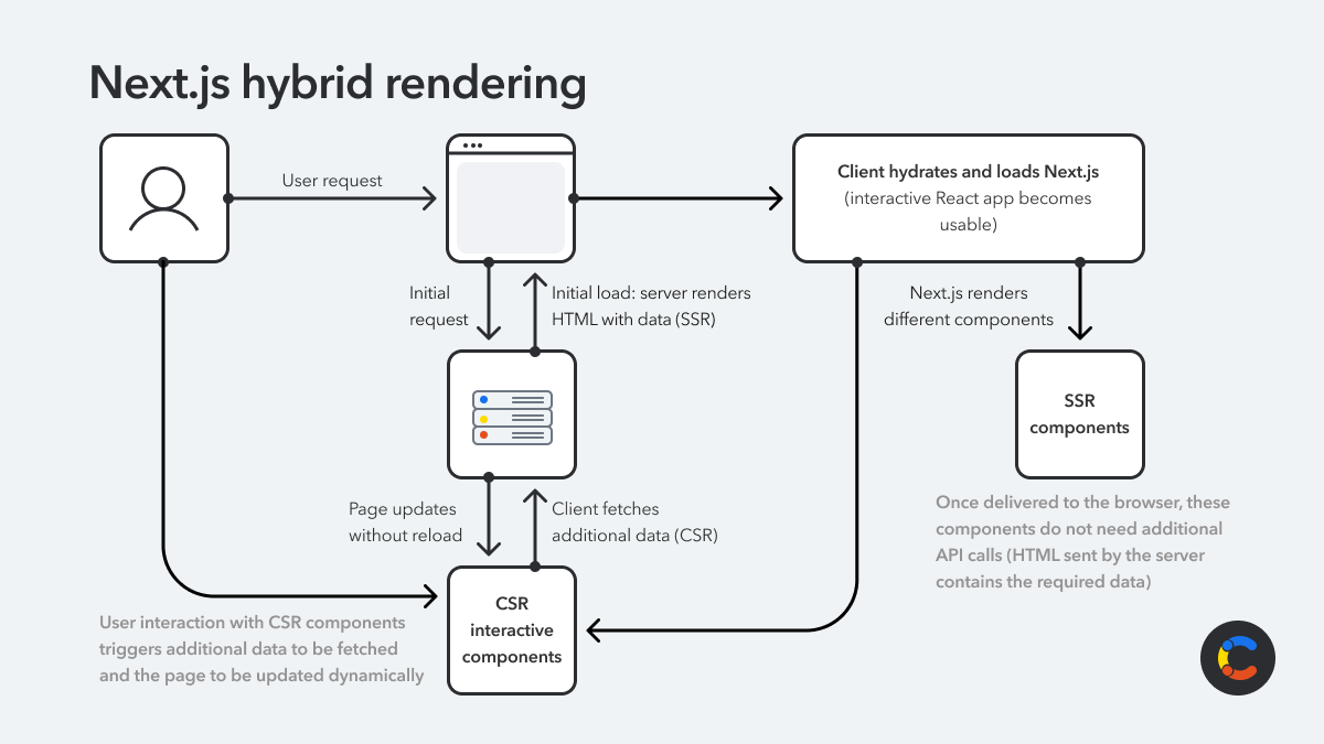 SSR is a process where the server pre-renders the page on each request, then sends the complete page HTML to the client (that is, everything that is on the page is provided in the initial request, and nothing is loaded afterward). This approach is best for SEO, as the content is present immediately for the search engine to index. It is also good for websites that focus on performance. Both Next.js and Remix offer this rendering method.