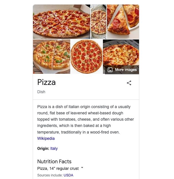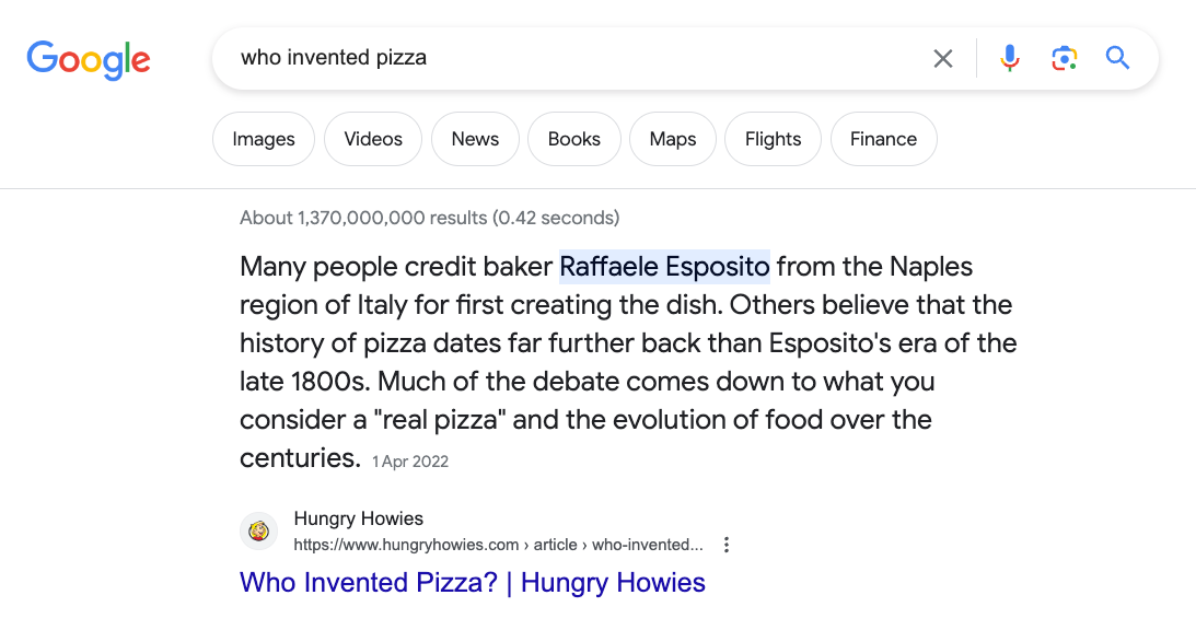 Let’s look at this search result for “who invented pizza.” Content gets pulled directly into the search results from the source, but they, of course, get the direct attribution with a link below the extracted text in the rich result: