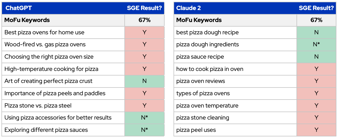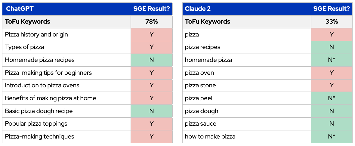 In our test results, there’s a big discrepancy between ChatGPT and Claude 2 results. ChatGPT triggered SGE results for ToFu keywords 78% of the time, whereas Claude 2 only triggered SGE results a third of the time. This is likely based more on ChatGPT-returned topics rather than keywords, despite my prompt for keywords. However, if you take most of ChatGPT’s ToFu keywords, it’s clear there are broad keywords behind these topics.