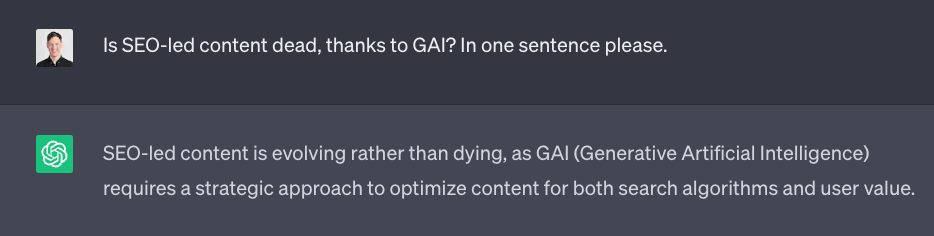 GAI may help you produce this content, but it can’t necessarily help you know what content to produce. The relationship between GAI and content creators is not one of replacement, but rather collaboration.