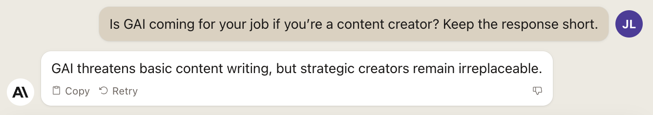 Don’t take my word for it — seriously, please don’t — but in my professional opinion, I would say if all you do is write, it might be advisable to get more involved in the entire content creation process: ideation, strategy, outlining, project management, workflows, editing, and so on. LLM chatbots cannot compete with a multifaceted content creator. And someone has to manage the bots. Take it from Claude: