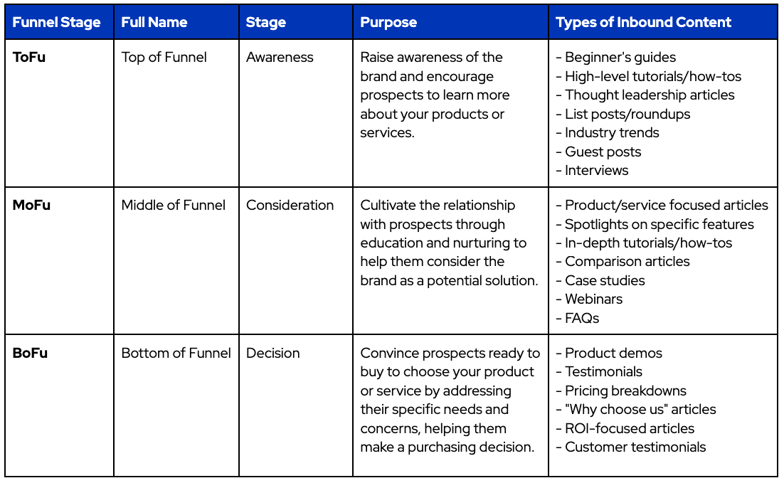 The three types of funnel stages are top of funnel (ToFu), middle of funnel (MoFu), or bottom of funnel (BoFu):