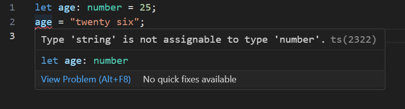 age = "twenty six"; // compiler error: "Type 'string' is not assignable to type 'number'."