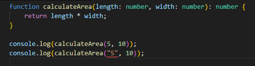 In the above image, TypeScript is providing type information to show that both length and width must be numbers, which causes an error later if one is later entered as a string. In JavaScript, the final line of code would run with no errors (as the string “5” would be silently converted to the number 5), creating a source of possible bugs later on during runtime.