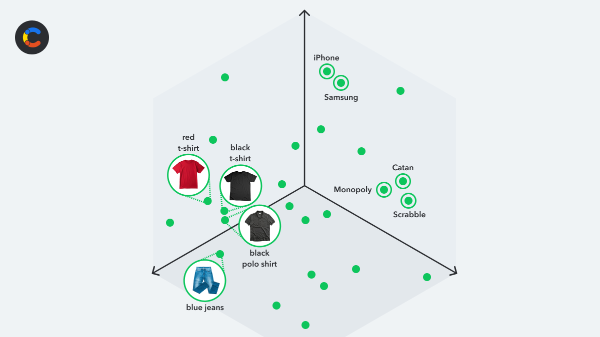 For these types of ML applications, the machine learning model needs to figure out which data is similar to other data. For example, in a scenario where an ML application is tasked with recommending products based on previous purchases, it would need to determine which products are similar to each other. In the below example, there are clusters for each of clothing, phones, and board games, but these clusters are located further apart as they are less similar to each other. Within the clothing category itself, similar items are closer to each other. For example, "black t-shirt" and "black polo shirt" are extremely close to each other (being the same color and shape), whereas "blue jeans" is further away.