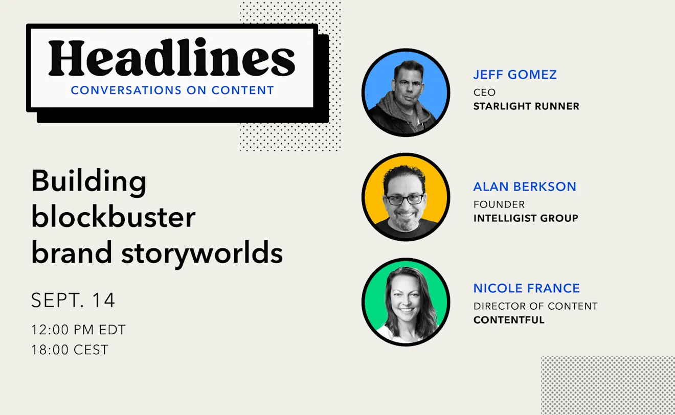 Are you ready to revolutionize your corporation's branding strategy? Join us for our next installment of Headlines: Conversations on content, hosted by Contentful and featuring experts in the field on September 14, at 9 a.m. PST/ 12 p.m. EST, as we delve into the realm of building and using a brand storyworld. Contentful’s Nicole France moderates with special guests Jeff Gomez, CEO at Starlight Runner Entertainment, and Alan Berkson, founder at Intelligist Group.