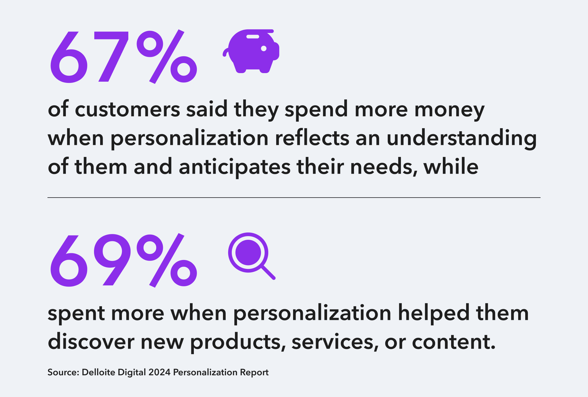 Ecommerce personalization rewards customers with personalized shopping experiences based on purchase history, browsing behavior, and other customer data, resulting in increased spending and customer loyalty.