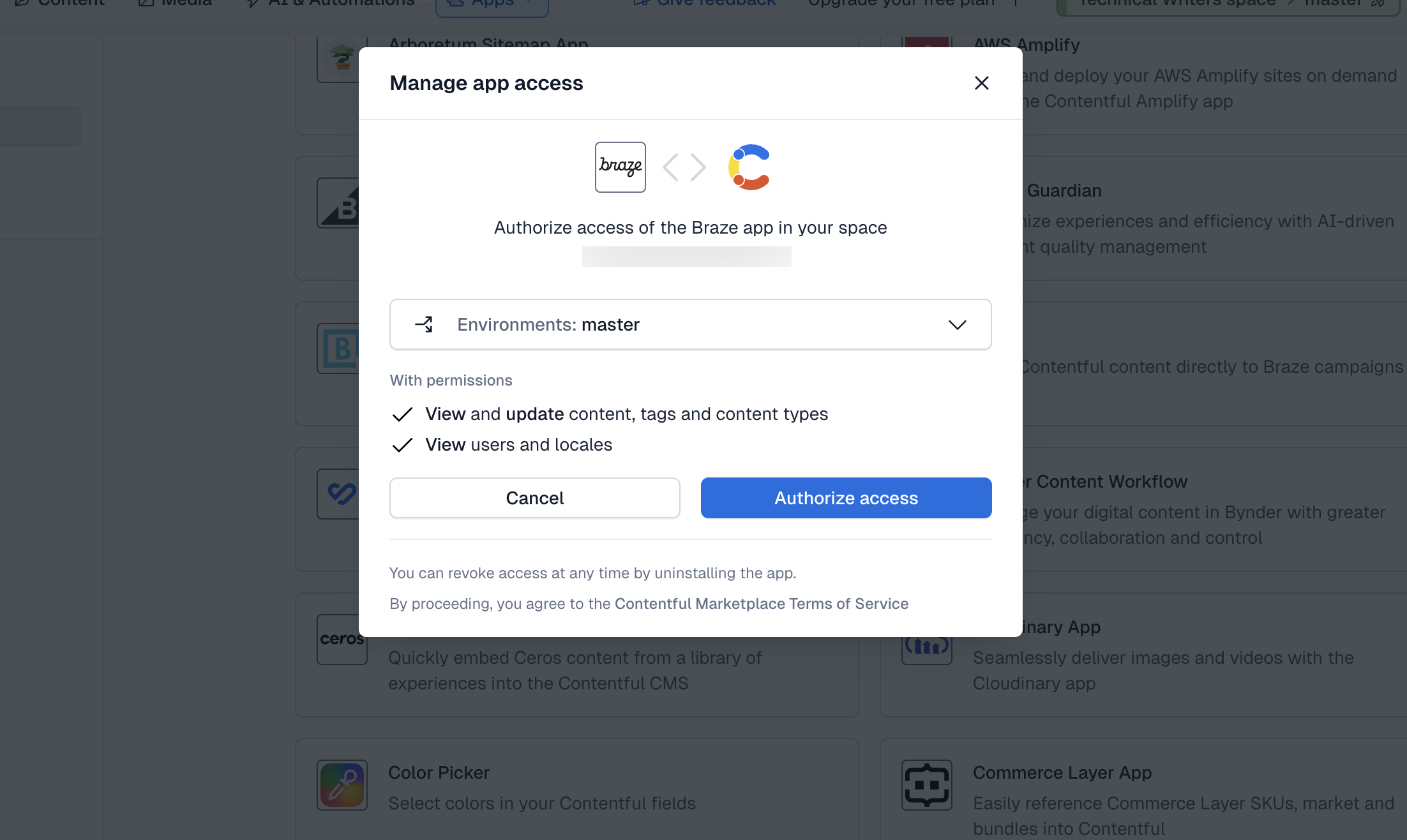 The Braze App allows marketers to directly sync approved content from Contentful into Braze campaigns. This eliminates the need for manually creating Braze Connected Content, reducing the risk of errors and ensuring that updates to content are propagated to campaigns automatically.