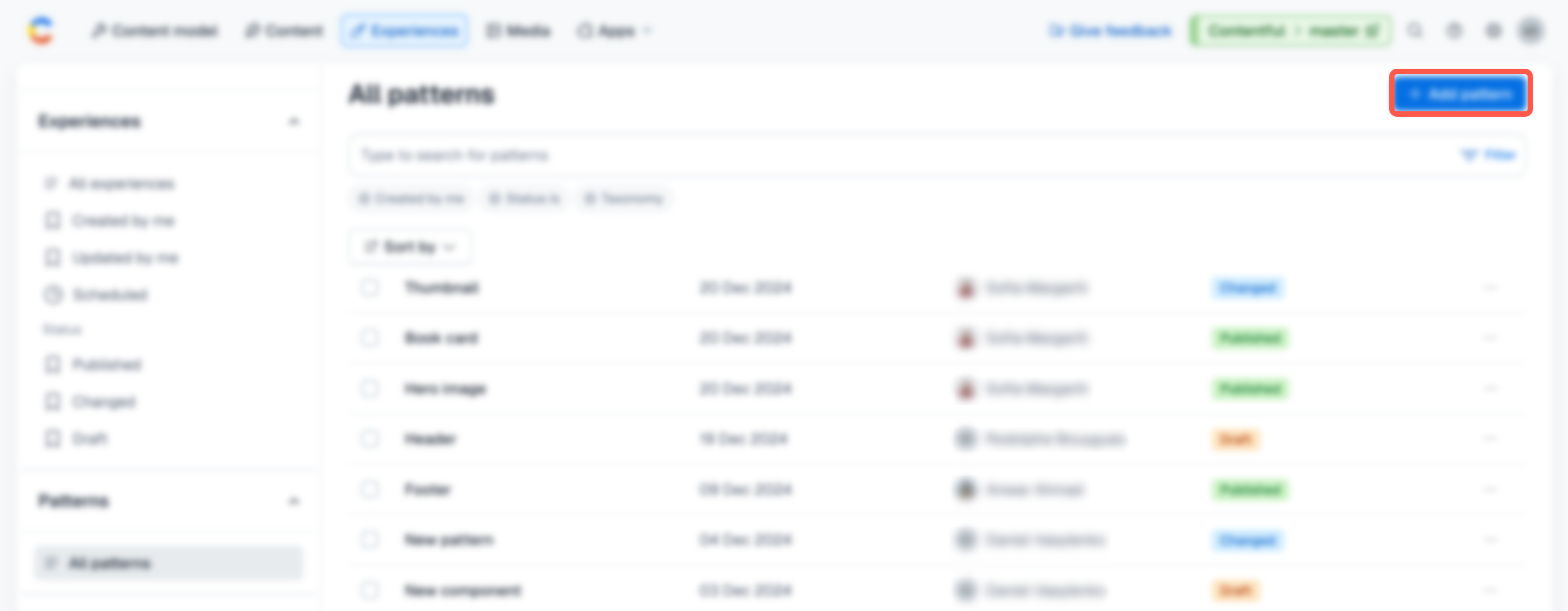 A pattern is a saved layout that can be reused statically across experiences. Changes to a pattern propagate to all experiences in which it is reused.