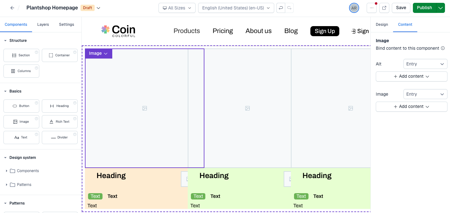 Nested patterns allow you to reuse patterns inside other patterns. The resulting pattern structures can further be reused in experiences. With nested patterns, you can create multi-layer layouts and edit the design properties at different layers. It means you can set up design templates once and reuse them across your experiences modifying their styles and binding different content to them.