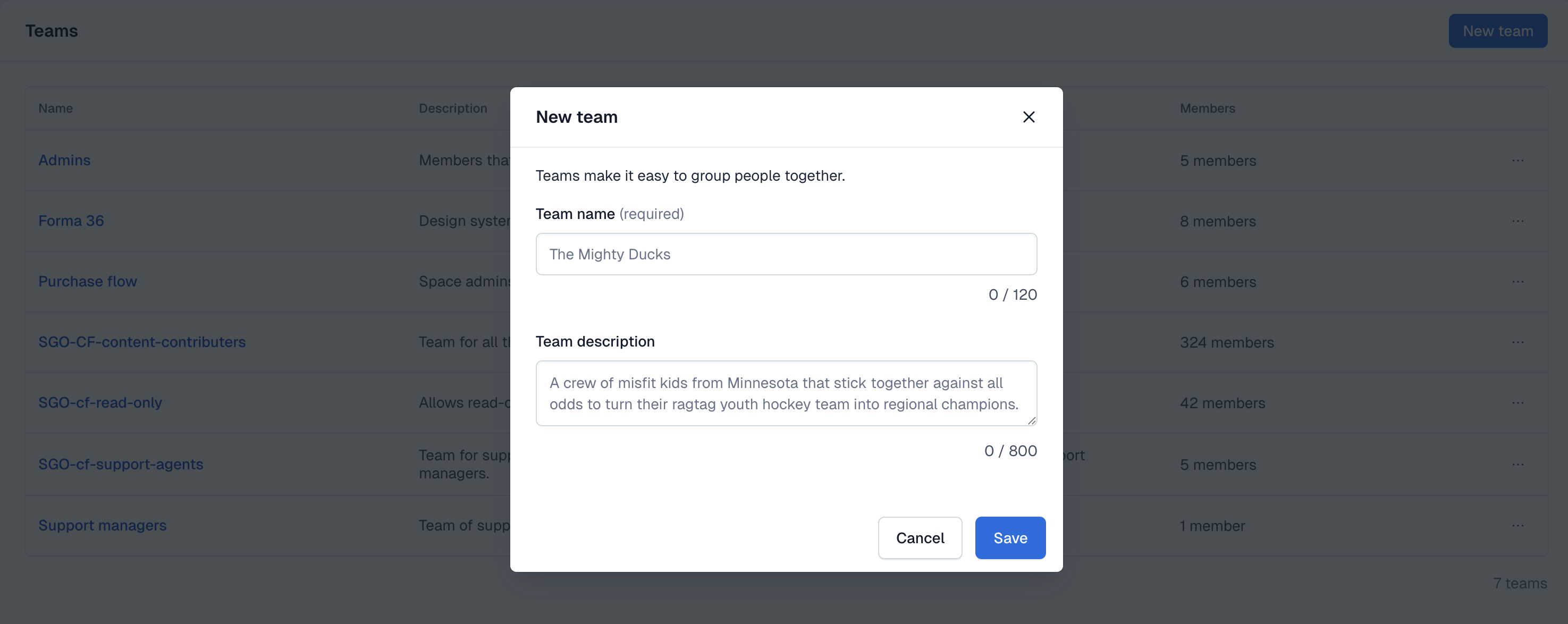 Click New team. The "New team" modal is displayed.