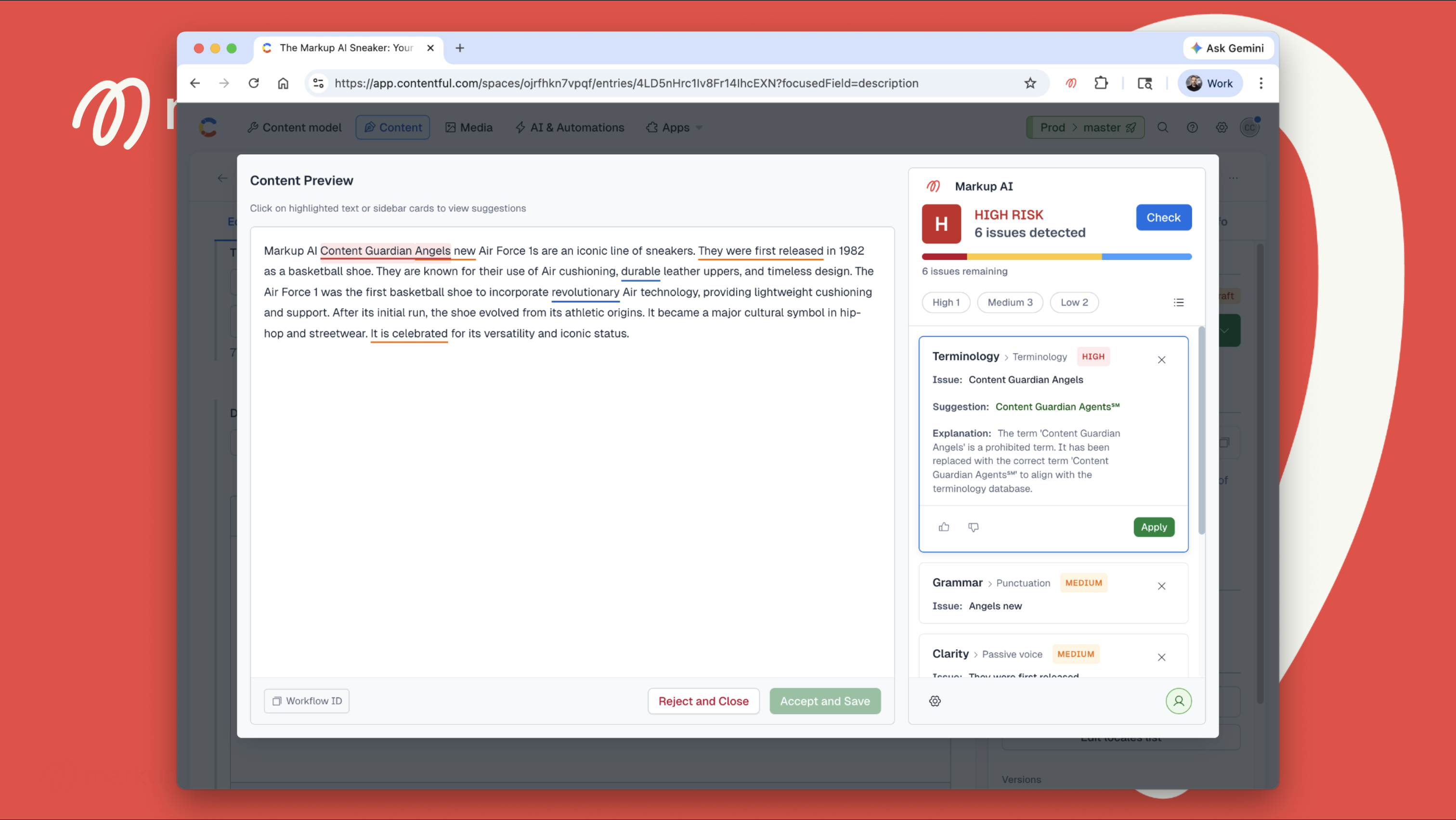 Unlike passive scanners, Markup AI puts you in control. Trigger content checks on-demand, prioritize issues by risk level, and apply corrections with confidence. The app delivers actionable suggestions with clear explanations, empowering your team to publish confident, high-quality content faster.