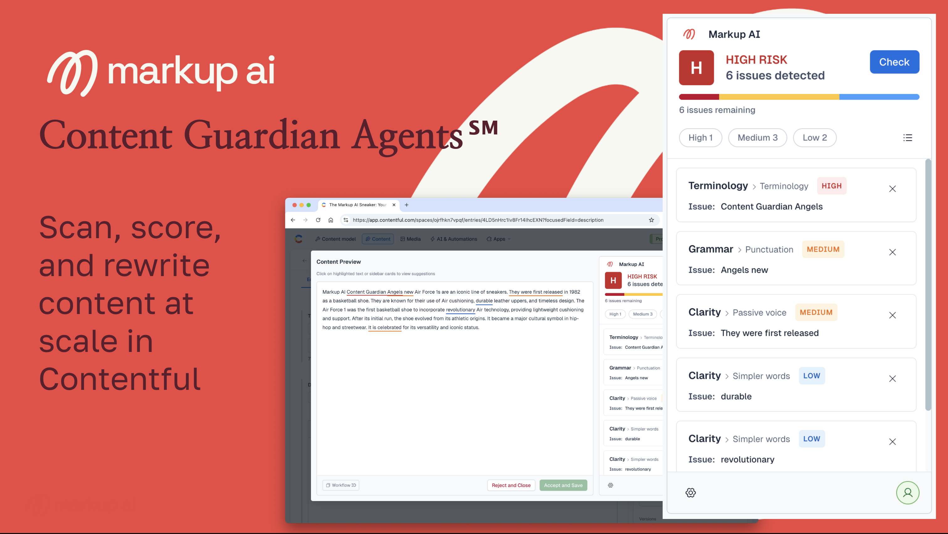 Markup AI is your intelligent Content Guardian Agent that seamlessly integrates into Contentful, ensuring every word meets your brand and compliance standards. Scan, score, and rewrite your human and AI-generated content with intentional-need based, structured analysis—without ever leaving your workflow.